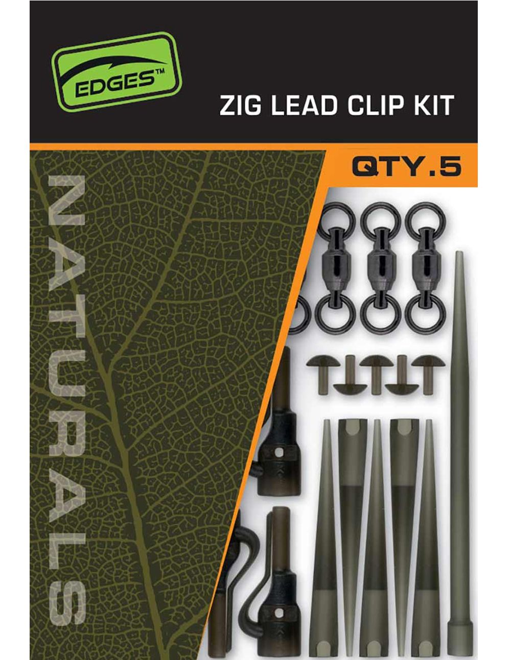 El Fox Naturals Zig Lead Clip Kit se suministra con todos los componentes necesarios para montar hasta cinco rigs completos: